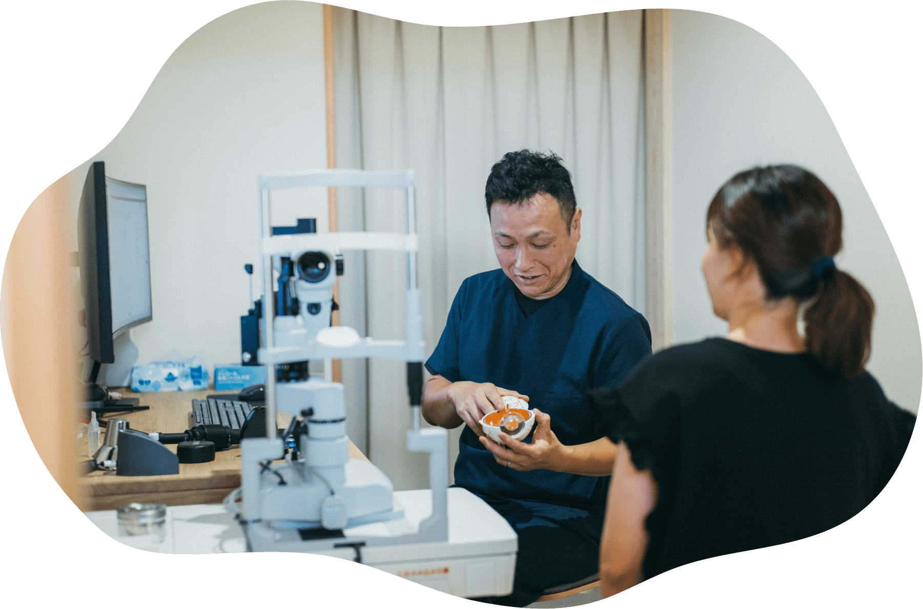 - 従来は片眼ずつ行うことが多かった視野検査ですが、両目を開けたまま楽な姿勢で連続検査できる機器を導入しています。
